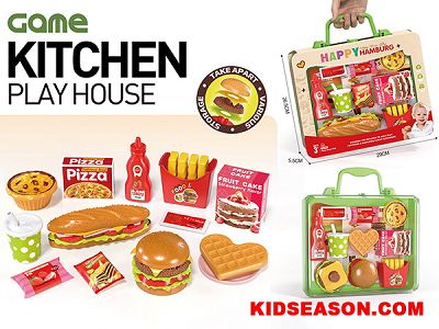 DESC: | PRETEND PLAY FAST FOODS HOT DOG HAMBURGER EGG TART FRENCH FRIES TOY SET WITH CARRIED CASE | |