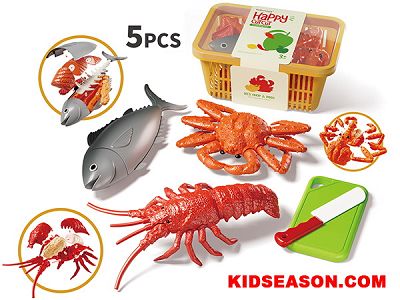 5PCS PRETEND PLAY CUTTING LOBSTER, TUNA FISH AND KING CRAB FOOD PLAY TOY SET WITH SHOPPING BASKET
