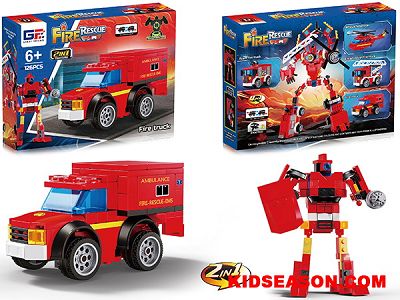 益智消防积木双回力Q版变形皮卡车(126PCS)4款混装