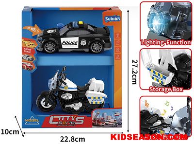 | 产品说明: | 城市特警套装 惯性特警车+惯性摩托车 灯光&声效 | |