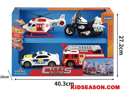 | 产品说明: | 城市套装 拉线飞机+惯性摩托车 惯性警车+惯性消防车 灯光&声效 | |