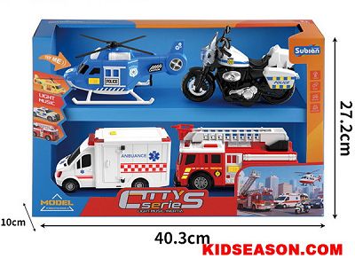 | 产品说明: | 城市套装 拉线飞机+惯性摩托车 惯性救护车+惯性消防车 灯光&声效 | |