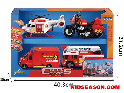 | 产品说明: | 城市套装 拉线飞机+惯性摩托车 惯性消防车+惯性消防车 灯光&声效 | |