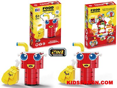 DESC: | 80PCS 2 IN 1 EDUCATIONAL PULL BACK TRANSFORMS MONSTER CHICKEN LEG AND COLA FAST FOODS BUILDING BLOCK TOY | |