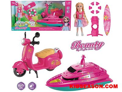 1:20 SCALE LIGHT UP & SOUNDS GIRLS FRICTION YACHT & FREE WHEEL MOTORCYCLE WITH DOLL TOYS SET