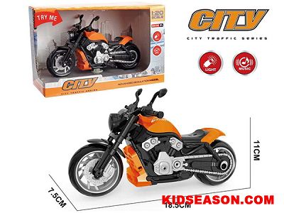 | DESC: | 1:20 SCALE LIGHT UP & SOUNDS FREE WHEEL HARLEY MOTORCYCLE TOYS - ORANGE | |