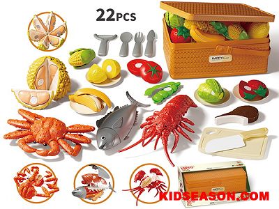 22PCS PRETEND PLAY CUTTING LOBSTER, KING CRAB, TUNA FISH AND DURIAN FRUITS FOOD TOY SET WITH PICNIC BASKET